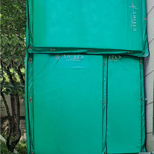 자재 사용 개요: 토목 공정에서 사용되는 디센더 장비의 토출부 기존 프레임에 간단하게 흡음패드를 덮음으로써 높은 차폐율을 통한 방음 시스템 구축